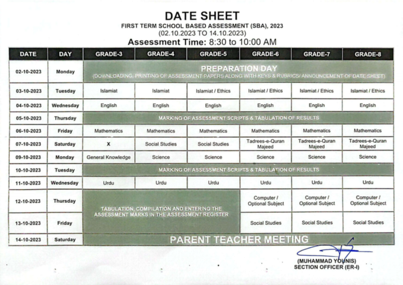 1st Term Revised Date Sheet for School Based Assessment 2023. By admin Share Share BeautyBlogBreaking DailyBusinessEducationFashionFoodsGamesHealthInspirationLifestyleScholarshipsTechTravelWorld First Term Revised Date Sheet for SBA 2023 September 30, 202362 views0 First Term Revised Date Sheet for SBA 2023. First Term Revised Date Sheet for School Based Assessment 2023. I am directed to refer to the subject cited above and to enclose the schedule / date sheet for First Term School Based Assessment (SBA), 2023 and to convey those following instructions / directions be adhered in letter & spirit: Teaching activities will continue as usual in classrooms after the assessment has been conducted. There will be no scheduled holidays when there is no assessment, and schools will remain open & operational, except on Sundays. All subject question papers, except for English and Urdu. are available in bilingual format. Schools have the flexibility to generate question papers for other subjects in either English, Urdu, or a bilingual format. Schools will generate OR-coded question papers by accessing the Item Bank System (IBS). The QR code contains comprehensive school information, including the EMIS code, which can be scanned using QR Code Scanning Application by monitors. Each system-generated paper for a subject will consist of one page comprising of 50 marks ( ten (10) MCQs & three (03) CRQs except Tadrees-e-Quran Majeed). For optional subjects other than computer science, schools will follow a similar pattern for assessment preparation. Assessment Scripts’ marking will be conducted promptly and in line with the standardized keys and rubrics generated alongside the papers in the IBS and simultaneously with the assessment process. During parent-teacher meetings, the focus will be on highlighting students’ positive aspects and discussing areas for improvement to enhance their learning experiences. First Term Revised Date Sheet for SBA 2023 Revised Date Sheet for SBA 2023 Share What's your reaction? Excited 0 Happy 0 In Love 0 Not Sure 0 Silly 0